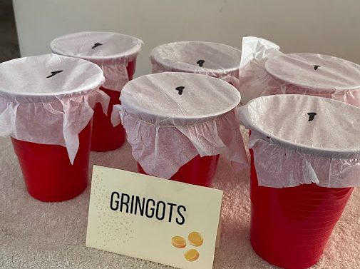 My daughter made a Gringotts Punch Out Game by placing treats and gold coins inside a cup, then adding tissue paper to the top with key holes drawn in the middle.