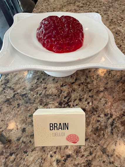 - Jello Brain – made with a brain mold we found at the dollar store a few years ago around Halloween. We like this one because we already have it and tell everyone it is to remember them having “death day parties” in the book.