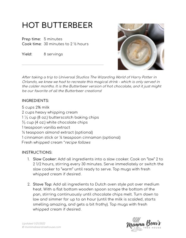 DOWNLOAD & PRINT the HOT BUTTERBEER recipe HERE, or keep scrolling to view it.